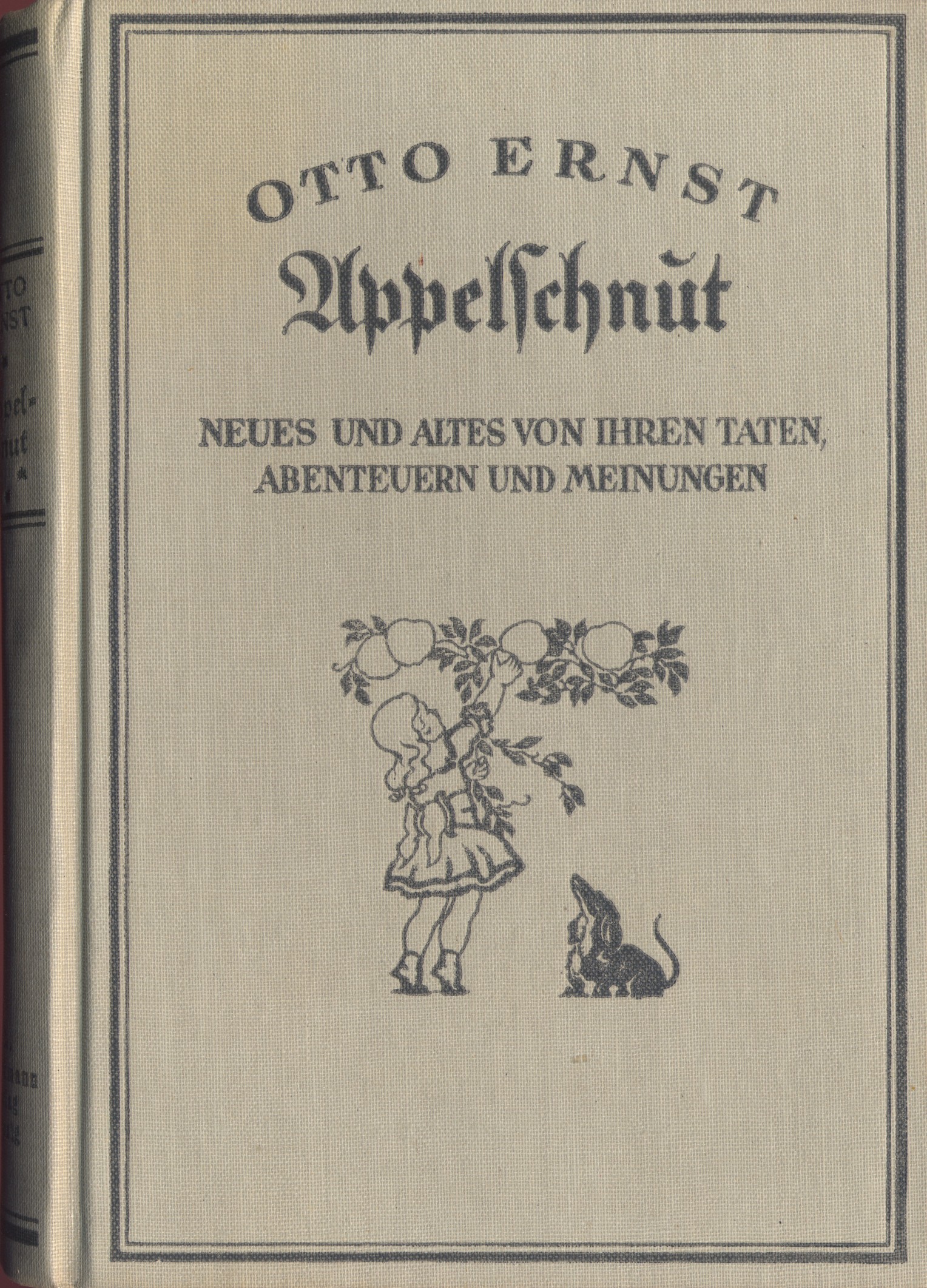 "Als 'Appelschnut' wurde die jüngste Tochter Zentralgestalt und Titelfigur von Erzählungen, Plaudereien und feinsinnigen psychologischen Skizzen von der Entwicklung eines Kindes, beschrieben in lockerer, heiterer Familienatmosphäre" Dierks in LKJ IV, 182). - Otto Ernst Schmidt (1862-1926) "war Dramatiker und Romanschriftsteller. Auf humorvolle Weise werden kleine Begebenheiten, Fragen und Gedanken der Dreijährigen aus der Perspektive des Erwachsenen erzählt, wobei er die vom norddeutschen Dialekt geprägte und altersbedingte Ausdrucksweise wiedergibt. Mahrholz (Deutsche Literatur der Gegenwart) zählt ihn zu den Vertretern der Heimatkunstbewegung und führt aus: 'Als Gegenbeispiel der süddeutsch-schweizerischen Erzähler ist etwa O. Ernst zu erwähnen, der vor allem in seinem Appelschnut hamburgisch-niederdeutsche Volks- und Landesatmosphäre in Gestalten und Schilderungen zu bannen weiß" (Slg. Brüggemann I, 211). - Ries, Wilhelminische Zeit, S. 864,3. Klotz I, 1313/2.